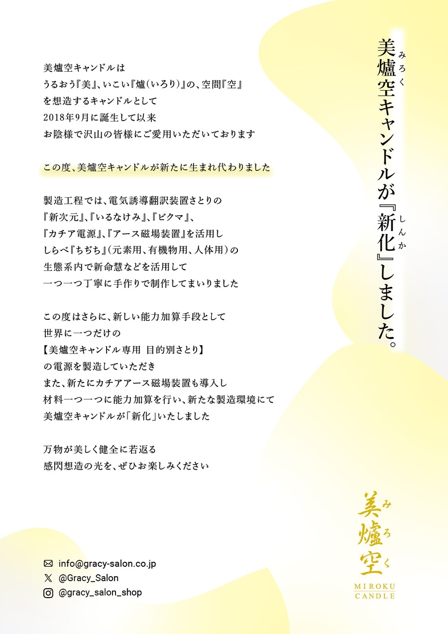 美爐空キャンドルは環境自体が本来持っている能力を最大限に高める目的のために生まれたキャンドルです。ご自宅や職場などの空間でご愛用ください。
