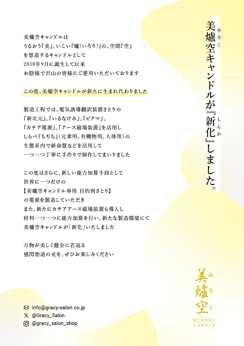 美爐空キャンドルは環境自体が本来持っている能力を最大限に高める目的のために生まれたキャンドルです。ご自宅や職場などの空間でご愛用ください。